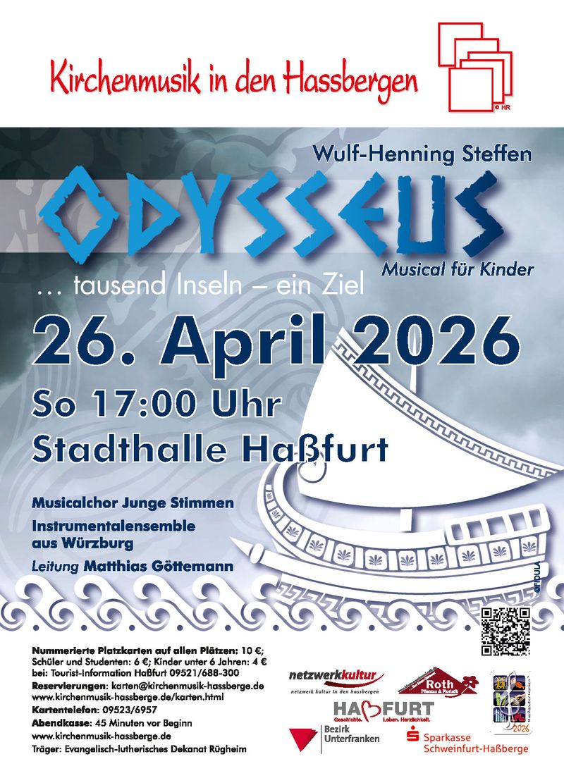 | Wisst ihr, was eine Odyssee ist? Wir benutzen den Begriff für Irrfahrt. Das Original, die abenteuerliche Schifffahrt des Odysseus und seiner Gefährten beschreibt Homer: Er soll der erste Dichter der abendländischen Welt sein - wir haben davon in der Schule gehört: Auf seinem Weg nach Hause auf die Insel Ithaka zu einer Frau muss Odysseus viele verrückte Abenteuer bestehen: Dem Riesen Polyphem stach er sein Auge aus – er hatte nur eines – und entkam ihm nur mit einer List, die Sirenen drohten die Seefahrer ins Verderben zu locken, die Zauberin Kirke verwandelte Odysseus‘ Gefährten in Schweine, der Windgott Aiolos schenkte Odysseus einen Schlauch aus Rindsleder, in dem er alle Stürme eingeschlossen hatte, aber seine Kameraden ließen diese aus Neugier wieder frei… Die Nymphe Kalypso verliebte sich in den griechischen Helden und wollte ihn gar nicht mehr gehen lassen. Als Odysseus dann endlich am heimischen Strand anlandete, musste er feststellen, dass seine Frau Penelope nach all den Jahren im Begriff war, einen anderen Mann zu heiraten. Seht die Abendteuer des Odysseus auf die Bühne gebracht, gesungen und gespielt vom Musicalchor Junge Stimmen unter der Leitung von Dekanatskantor Matthias Göttemann. Der Chor ist zugleich Unterstufenchor des Regiomontanus-Gymnasiums Haßfurt. Er ist schulübergreifend – so singen auch einige Kinder aus anderen Schulen mit. Die Darsteller treten in malerischen Kostümen auf, singen live und werden von einem kleinen Orchester aus Profi-Musikern mit Flöte, Akkordeon, Violine, Violoncello, Kontrabass, Klavier und Schlagzeug begleitet. Die Aufführungen sind aufwändig mit Beleuchtung und Tontechnik ausgestattet. Weitere öffentliche Aufführung am Montagvormittag, besonders für Schüler, Mo. 27. April 2026 um 10:30 Uhr |