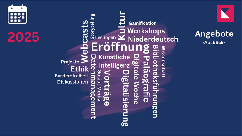 | | | | | Auch im Jahr 2025 bietet die Schleswig-Holsteinische Landesbibliothek erneut ein vielfältiges Veranstaltungsprogramm. Unser Zentrum für Digitalisierung und Kultur stellt kostenlose Bildungsangebote sowohl für Kulturschaffende als auch für die Bürgerinnen und Bürger Schleswig-Holsteins bereit. Wenn Sie keine unserer zukünftigen Veranstaltungen verpassen möchten, hält Sie dieser Newsletter stets auf dem neuesten Stand. Wir freuen uns auf Ihre Teilnahme! | | | | | | |