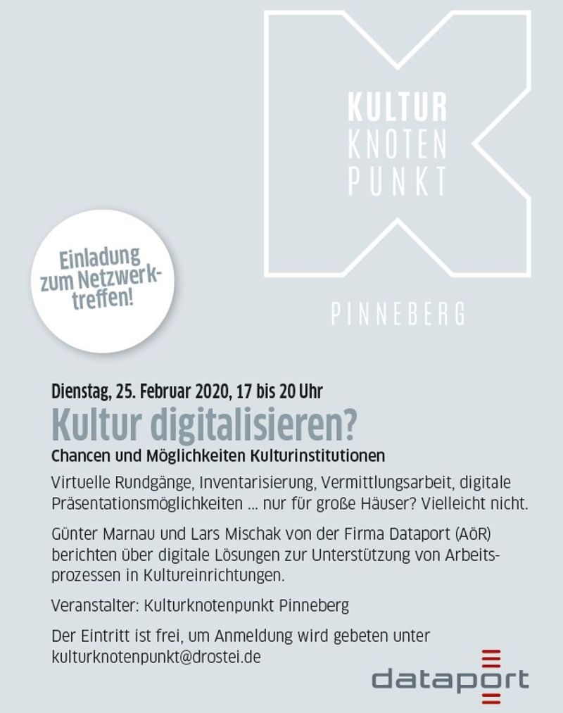 | | | | | Was bedeutet Digitalisierung in der Kulturarbeit? Wo könnte der Mehrwert sein? Was ist finanziell leistbar, auch und gerade für kleine, oft ehrenamtlich geführte Einrichtungen? Welche neuen Möglichkeiten werden erschlossen? Um diese Fragen geht es beim Netzwerktreffen des Kulturknotenpunkts Pinneberg. Günter Marnau und Lars Mischak von der Firma Dataport zeigen Möglichkeiten und Chancen für Kulturinstitutionen auf und stehen für Fragen zur Verfügung. Die Teilnahme ist kostenlos. Bitte meldet euch an unter kulturknotenpunkt@drostei.de. Veranstaltungsort ist Die Drostei, Dingstätte 23, 25421 Pinneberg (Für den Navi: Am Drosteipark) | | | | | | | | |