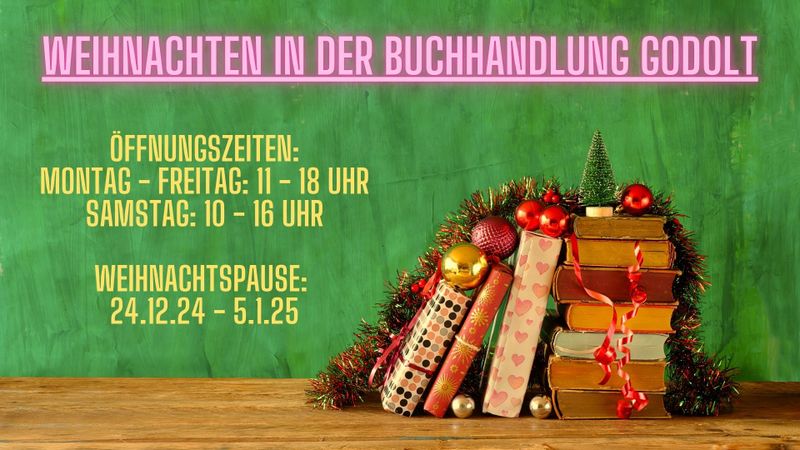 | Liebe Freundinnen und Freunde der Buchhandlung Godolt, alle Jahre wieder sind wir fleißige Weihnachts-Wichtel, die mit ultimativen Geschenk-Tipps, großer Expertise beim Geschenk-Verpacken und Nerven aus Lametta - äh Stahl - festlich glänzen. Bis einschließlich Montag den 23. Dezember könnt ihr unsere Superkräfte noch in Anspruch nehmen und in eurer Lieblingsbuchhandlung nach Geschenken stöbern. Danach verabschieden wir uns in eine kleine Winterruhe und freuen uns auf ein Wiedersehen am 6. Januar. Wir wünschen euch allen friedvolle und erholsame Feiertage ! Inga, Christopher, Linus & Herbert Unsere Öffnungszeiten: Mo - Fr 11 - 18 Uhr