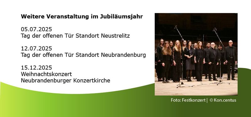 | | | | | Die Kreismusikschule (KMS) Kon.centus startete im März mit zwei Konzerten ins 70. Jahre ihres Bestehens. Den Auftakt machte hier das große Festkonzert „70. Jahre Musikschule“ in der Neubrandenburger Konzertkirche. Der musikalische Abend wurde durch verschiedene Ensembles und Solisten und Solistinnen der Musikschule gestaltet. In dem daran anschließenden Dozentenkonzert Ende März gaben dann im Foyer der Musikschule nicht die Schülerinnen und Schüler ein Konzert, sondern deren Lehrerinnen und Lehrer. Im April gaben Solisten und Ensembles der KMS, welche beim Wettbewerb „Jugend musiziert“ geehrte wurden im Heinrich-Schliemann-Saal in Neubrandenburg ein Konzert, mit Ausschnitten aus dem Programm, mit dem sie beim Wettbewerb angetreten waren. Ein weiterer besonderer Höhepunkt im Jubiläumsjahr fand Anfang Juni statt. Zum „80er Jahre Konzert“ in der Konzertkirche Neubrandenburg trafen sich Musikerinnen und Musiker der Musikschulen Szczecinek und Kon.centus und fünf junge polnische Sängerinnen und Sänger, zu einem gemeinsamen Konzert. Die Kooperation beider Musikschulen besteht seit fast 20 Jahren und hat in der Vergangenheit viele spannende Projekte hervorgebracht. Zur Webseite der Kreismusikschule Kon.centus -->Kon.centus | | | | | | |