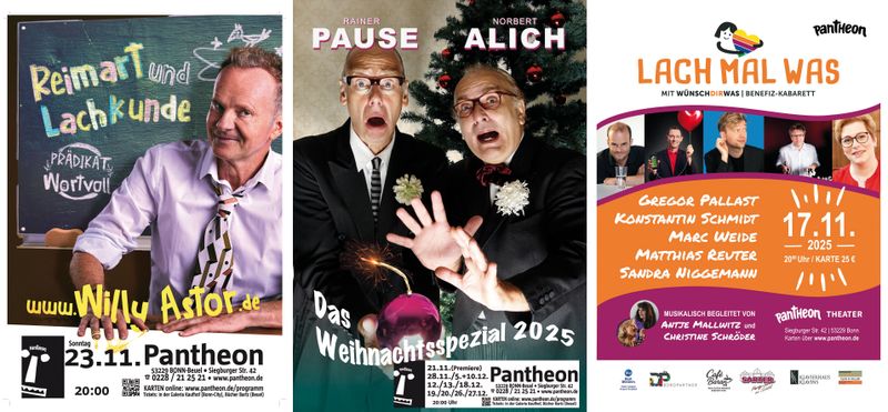 | Es sind nun just 9 Jahre her, dass wir hier in Beuel eine schöne neue Heimat gefunden haben. Wir sind froh, dass Sie weiterhin so zahlreich unser Haus besuchen und offensichtlich auch gerne immer wieder kommen. Gründe fürs Wiederkommen gibt es in den kommenden Wochen reichlich! Vom ersten Augenblick an haben Sie das mit viel Liebe vor allem nach den Ideen von Martina Steimer ausgestaltete Beueler Domizil ganz offensichtlich ins Herz geschlossen. Seit diesem in rasantem Tempo umgesetzten Umzug vom alten Bundeskanzlerplatz in die Siegburger Straße ist so Einiges passiert in der Welt aber auch sehr, sehr viel auf unserer Bühne. Die Welt ist eine andere geworden, deshalb haben wir das sichere Gefühl, dass eigentlich alle Kulturorte für viele Menschen immer noch wichtiger geworden sind, denn es sind die Orte, an denen sich Menschen in Offenheit zusammenfinden statt sich voneinander abzugrenzen. Das Gemeinschaftsgefühl stärkt die Seele. Es öffnen sich dort neue Horizonte, Theater und Musik inspirieren, entspannen, machen Gänsehaut und wühlen auf, begeistern, geben neue Energie, Orientierung und vielleicht auch Ideen für den Umgang mit dem Alltag. Kabarett, Comedy, schräger Witz lassen uns den Ernst des Lebens weitaus leichter ertragen und geben schlagfertige Argumente sich der Humorlosigkeit der Machtbesessenen entgegenzustellen. Auf dem Weg Richtung Weihnachtszeit wird der Humor und die Musik bei uns ganz sicher nicht zu kurz kommen und auf die Zeit der Besinnlichkeit, des Schenkens und Beschenkt werdens, sind wir für Sie recht gut vorbereitet: Im November gilt es, einige markante Jubiläen zu feiern: am 10.11. zelebriert die griechische Kultformation Locomondo in einem exklusiven Clubkonzert ihr 20jähriges Bühnenjubiläum und bringt den Pantheonsaal mit Reggae und Rembetiko zum Kochen, ein Leckerbissen für alle Weltmusikfans. Doppelt so lange, nämlich 40 Jahre (!) steht Willy Astor auf den Kleinkunstbühnen, der Spezialist für Reimart und Lachkunde ist dazu ein Virtuose an der Akustikgitarre. Sein Solo gibt’s am 23.11.. Ein Big Band-Abend mit mitreißendem Jazz & Swing steht am 5.11. auf dem Programm: Die Big Band der Bundeswehr gibt eines ihrer legendären Clubkonzerte und spendet ihre Gage, um den Verein G.I.S. Bonn e.V. zu unterstützen. Auch die Eintrittsgelder des Kabarett- und Comedy-Benefiz „Lach mal was mit wünschdirwas“ am 17.11. (u.a. unter Mitwirkung von Zauberweltmeister Marc Weide und Kabarettist Gregor Pallast, der einen Vorgeschmack auf seine Kabarettpremiere im Dezember geben wird) werden gespendet, hier sorgen die Einnahmen für die Erfüllung von Herzenswünschen schwerkranker Kinder. Und Elke Heidenreich liest am Morgen des 15.11. (der leider bereits ausverkauft ist) zugunsten des Weihnachtslicht e.V.. „Moritz Eggert wird 60“ – der großartige Pianist und Komponist ist nebst pianistischen Kolleginnen und Kollegen bei der neuen Ausgabe von Susanne Kessel´s „Beethoven Piano Club“ am 3.11. - also heute um 19 Uhr (!) zu erleben. Eggert gilt als einer der prägendsten Vertreter der zeitgenössischen Musik in Deutschland. Er verbindet traditionelle Formen mit humorvollen, experimentellen und genreübergreifenden Ansätzen. Der mittlerweile 7. KlassikSlam zeigt das Können junger, hoffnungsvoller Musiker und Ensembles und bringt klassische Musik auf neuen Wegen direkt ins Publikums-Herz!. Der KlassikSlam geht am 18.11. über die Bühne des Pantheon mit Special Guest William Wahl (!) Mehrere Bonnpremieren stehen auf unserem Programm. Besonders empfehlen möchten wir Ihnen das neue Solo "Sachen gibt´s..." vom mehrfach preisgekrönten Kabarettisten Matthias Brodowy am 6.11.. Auch das Musik-Coverett-Duo „Reis Against the Spülmachine“ – Warmupper beim diesjährigen Wacken-Festival - zeigt erstmals in Bonn seine neue Bühnenshow „Tourlaub“ am 7.11.. Von Comedy-Urgestein Ingo Appelt kommt in seinem neuen Solo "Männer nerven stark" am 12.11. ganz frei nach Rio Reiser und Norbert Krause die durchaus berechtigte Forderung "Lacht kaputt, was euch kaputtmacht". Virtuoses Musikentertainment der Extraklasse gibt es am 27.11. von der 5köpfigen Schlagzeugmafia und am 29.11. von den swingenden drei Zucchini Sistaz mit ihrer fulminanten Weihnachtsshow. Murzarella, begleitet von ihrer witzigen Puppenschar beherrscht am 4.11. nicht nur die Kunst des Bauchredens, sondern gar die des Bauchgesangs(!). Sehnsüchtig erwartet ist selbstverständlich die Premiere des neuen „Weihnachtsspezial“ der beliebten Lokalmatadoren Rainer Pause und Norbert Alich am 21.11. (weitere Vorstellungen: am 28.11. und natürlich im Dezember), - Auch Sie sind sicherlich gespannt, was ihre Alter-Egos „Fritz und Hermann“ dieses Mal so alles Heikles verbal anpacken, einpacken und auspacken, sie stimmen uns auf ihre unvergleichlich streitende Art auch in diesem Jahr treffsicher aufs Weihnachtsfest ein. Hinweis: ausnahmsweise und auch nur beim Weihnachtsspezial bieten wir betrieblichen Weihnachtsfeiern ab 10 Personen eine Gruppenreservierung an, Anmeldung dafür ist unter vorverkauf@pantheon.de möglich. Wer die großartigen Soli von Tobias Mann und Jochen Malmsheimer das letzte Mal verpasst hat, bekommt nun eine neue Chance: Malmsheimers aktuelles Programm wird für den WDR5-Hörfunk am 13.11. bei uns aufgzeichnet und Tobias Mann kommt am 30.11. mit "REAL/FAKE". Und, um nochmals aufs "Wiederkommen" zurück zu kommen: eröffnet haben wir 2016 mit einer Vorstellung von Dave Davis, der übrigens im März 2026 bei uns Premiere mit seinem neuen Programm feiern wird - Diese Premiere im März ist übrigens Bestandteil eines unserer neuen Weihnachts-Abonnements, die nun verfügbar und durchaus auch verschenkbar sind. Mehr dazu samt weiterer Geschenktipps s.u.! Wir sind in jedem Falle sehr gerne auch weiter für Sie da und freuen uns auf Ihr Kommen! Herzlichst Ihre Pantheoniken |
