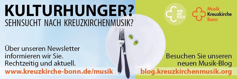 | | | | | Liebe Freundinnen und Freunde der Kreuzkirchenmusik, wie sehr haben wir uns alle einen Winter gewünscht, der uns normale Konzertbesuche ermöglicht. Aber die Pandemie hält uns leider alle weiterhin gefangen und gibt keine Ruhe... Seit dem letzten Newsletter sind die Inzidenzzahlen wieder soweit gestiegen, dass es neuer Maßnahmen bedarf. So müssen wir wieder Lösungen suchen, unsere Musikerinnen und Musiker und auch unser Publikum so gut wie irgend möglich vor einer Ansteckung zu schützen. Und dennoch wollen wir Musik, Kultur und nicht zuletzt das, was uns in der Seele bewegt, weiterhin ermöglichen. Mit diesem Newsletter möchten wir Sie nun also über die Regelungen für Konzertbesuche in der Kreuzkirche in der kommenden Zeit informieren. In den nächsten Tagen erhalten Sie einen Newsletter mit allen Veranstaltungen bis Jahresende und einem kleinen Ausblick ins Jahr 2022! Derzeit arbeiten wir am Halbjahresprogramm für das erste Halbjahr 2022 - Sie dürfen gespannt sein! Auf unserer Homepage finden Sie alle Termine. Der Vorverkauf für alle Konzerte läuft wie immer über BonnTicket. Gerade in letzter Zeit ist unser Blog immer mehr gewachsen - viele Ensemblemitglieder haben ihre Eindrücke aus Proben und Konzerten geschildert - schauen Sie doch mal vorbei und kommentieren Sie gern! Wir freuen uns, Sie in unseren Konzerten zu sehen - ganz unter dem Motto IM MOMENT MUSIK! | | | | | | |